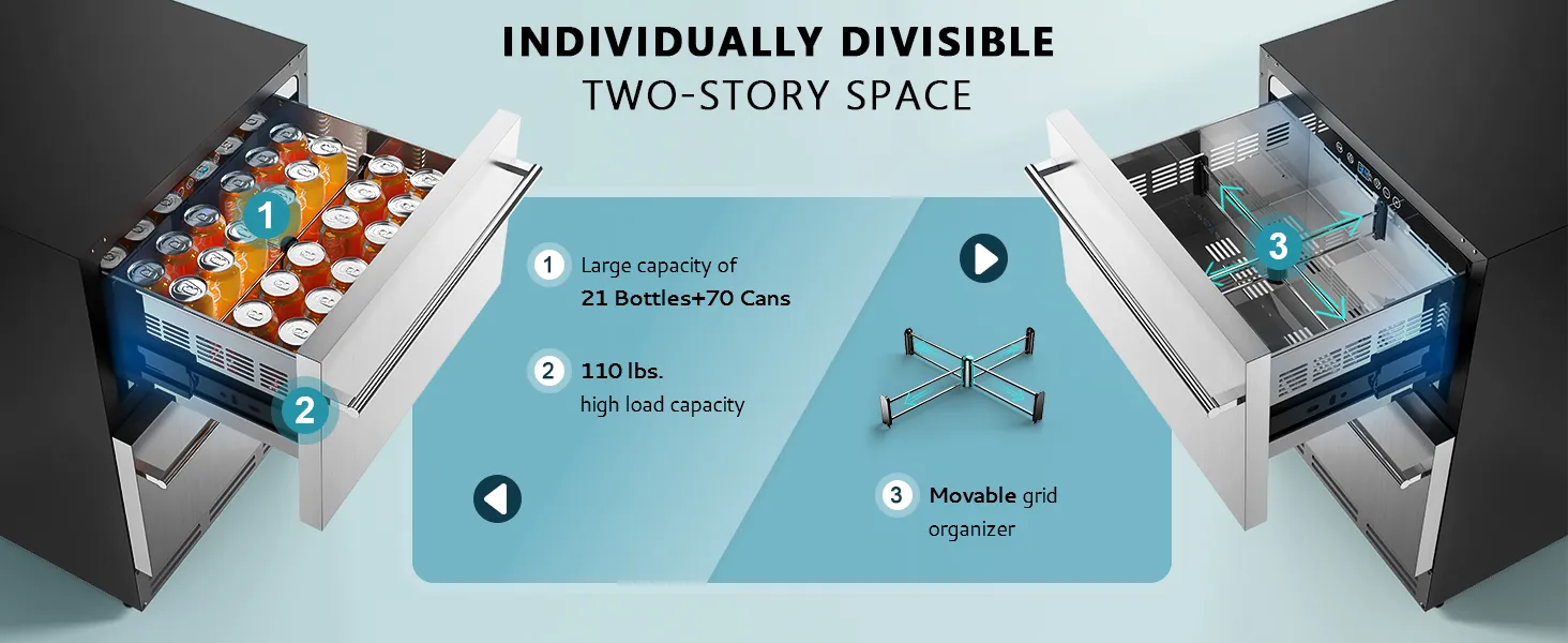 304 stainless steel dual-drawer outdoor fridge for patios, kitchens, and bars. This professional cooling solution holds up to 21 wine bottles and 70 cans with weatherproof durability.